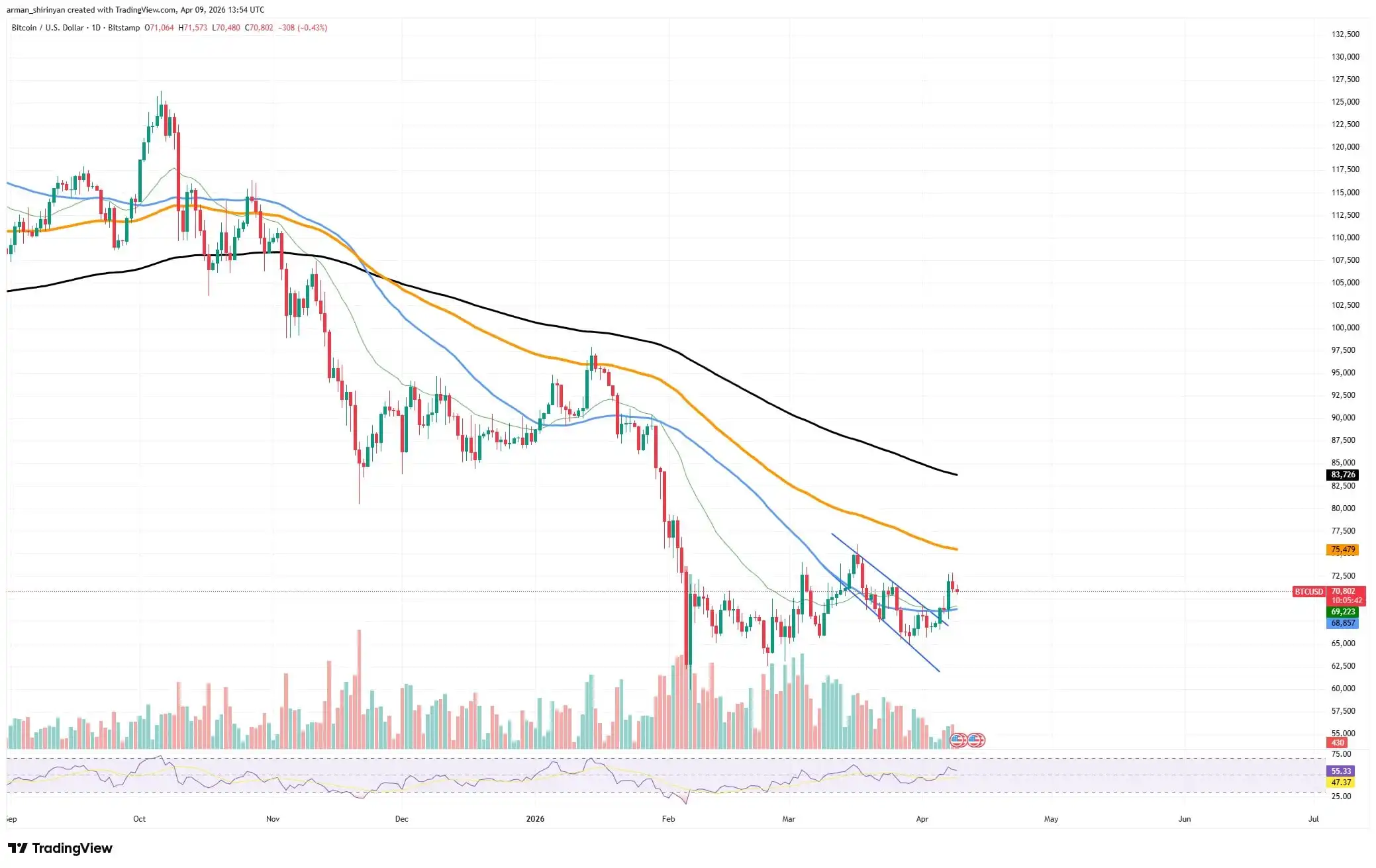 $BTC trades at $71,666 on April 10, pressing into the descending channels upper boundary for the fir