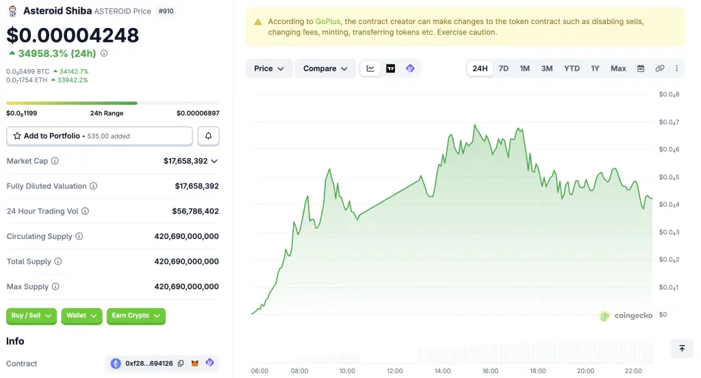 A new memecoin, Asteroid, has taken the crypto market by storm, jumping from a tiny $50K market cap