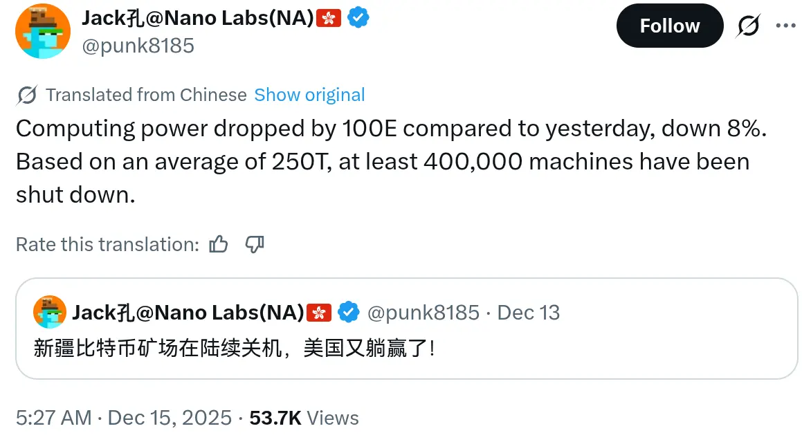 Bitcoin‘s hashrate fell by about 10% in a single day on Sunday, with Jianping Kong, former co-chairm