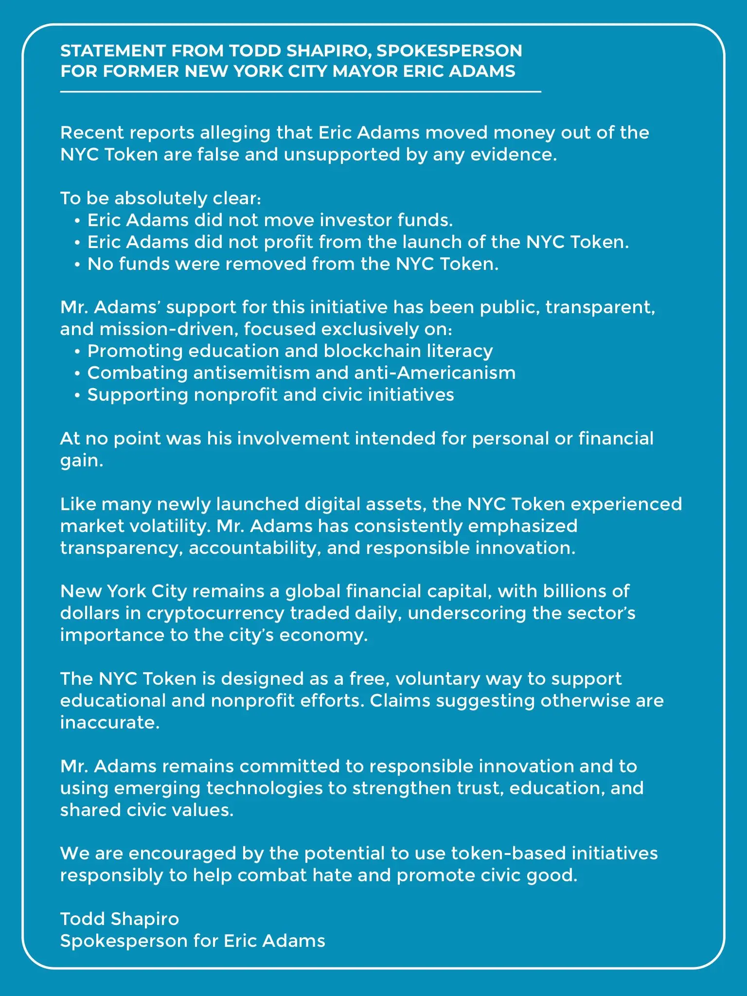 A spokesperson for former New York City Mayor Eric Adams has refuted accusations that he moved money