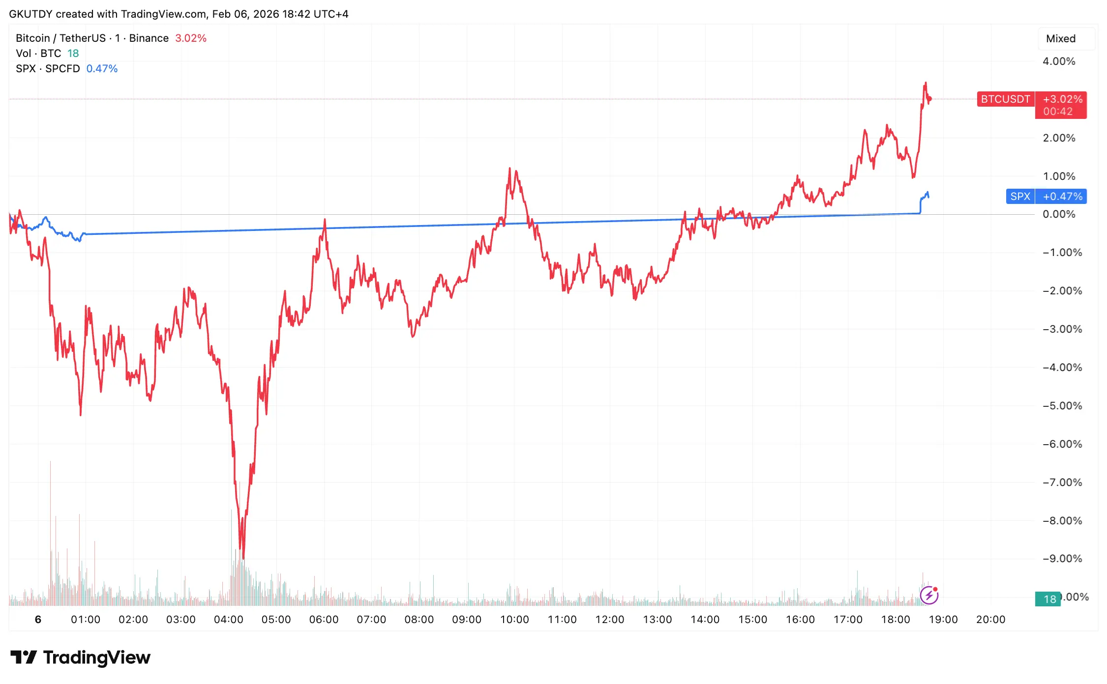 Bitcoin surged 10% to $66,800 just a day after a 17% crash, while the S&P 500 took only a 0.47% upsi