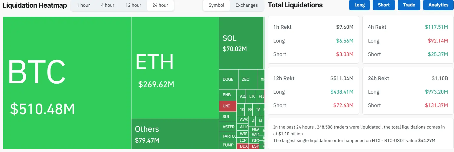 The cryptocurrency market faced $1.1 billion in liquidations over 24 hours on November 14, 2025, wit
