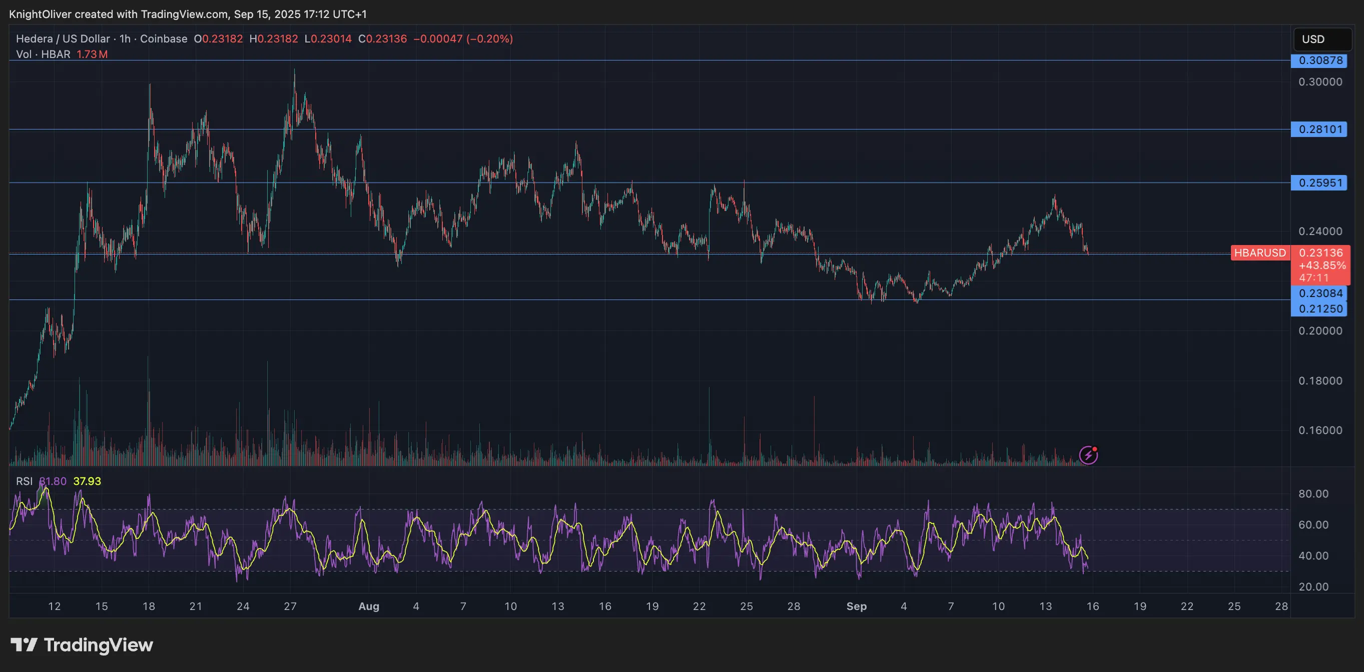 HBAR traded with sharp volatility over a 23-hour window from September 23 to 24, gaining just 0.90%