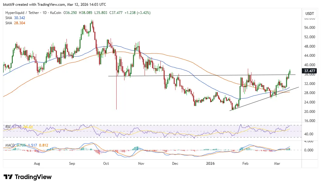 Hyperliquid price rose to its highest level in over a month as it touched $38.08.The $HYPE is up ami