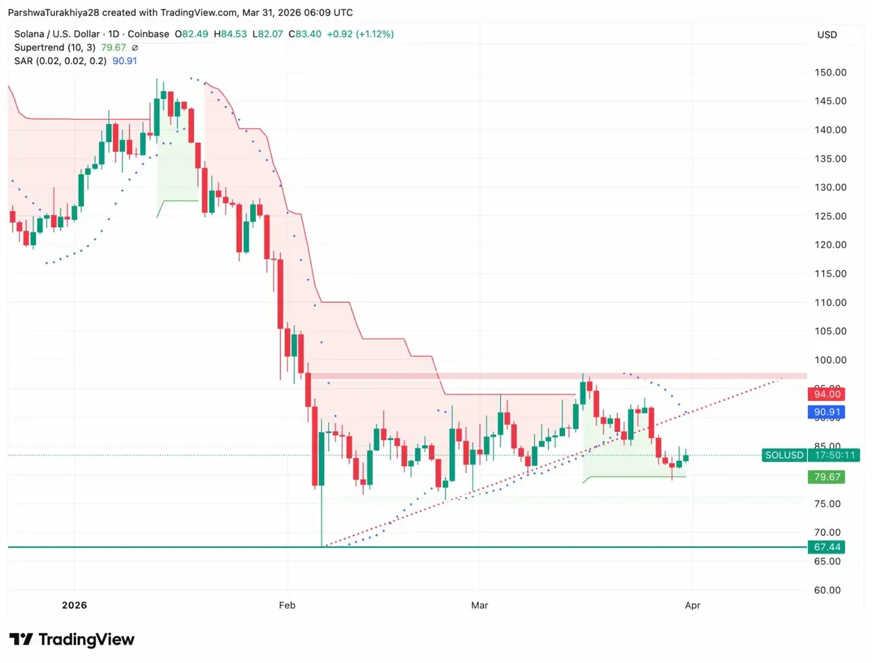 $SOL trades at $83.40 on March 31, down 77% from its all-time high, as US spot ETFs bleed for a thir