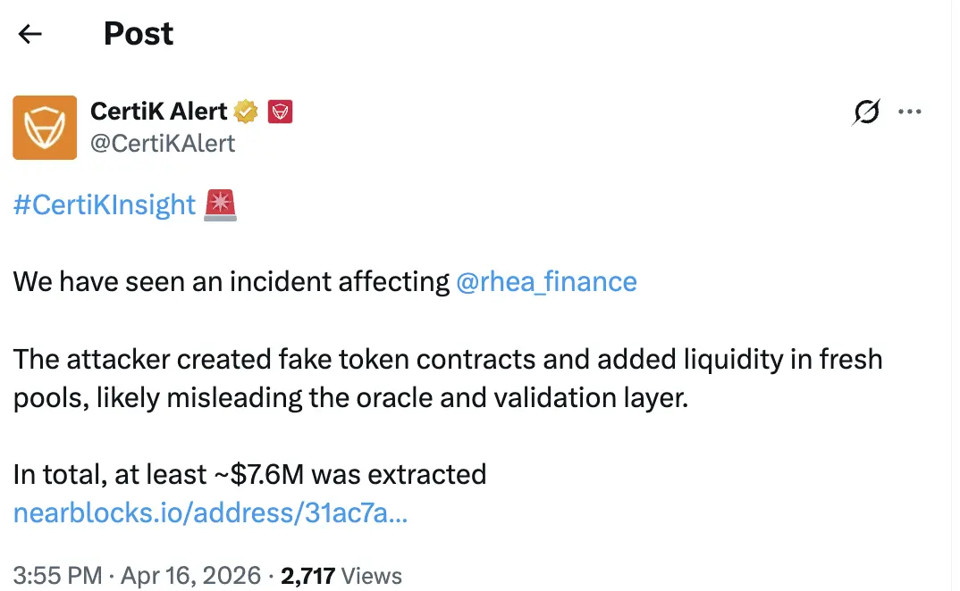 Rhea Finance has been hit by a suspected exploit, with blockchain security firm CertiK reporting tha
