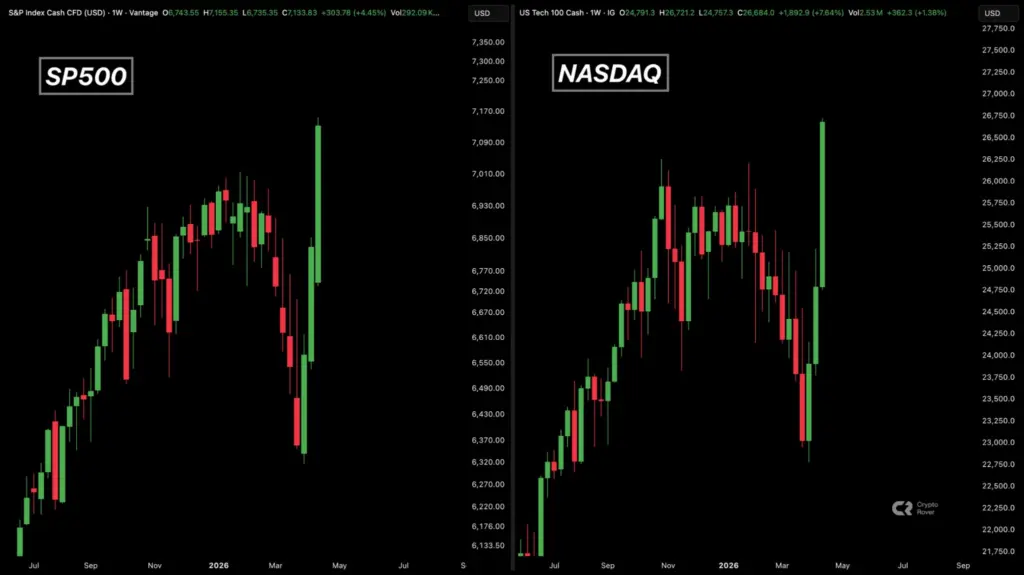 S&P 500 weekly closes surge above $7,000, the NASDAQ above $24,000, and $BTC surges on institutional
