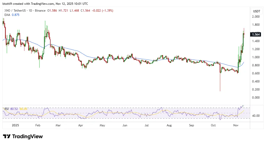 Nano price rose by more than 30% in 24 hours to hit highs of $1.72 on November 12, 2025.XNO gained a