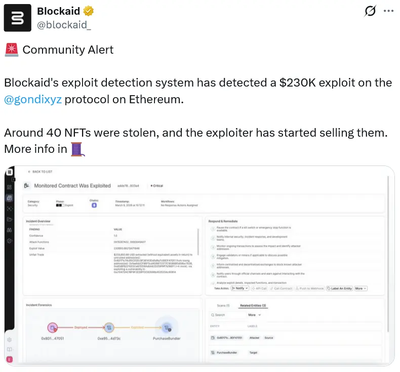 NFT lending protocol Gondi says platform secured after $230K exploit,