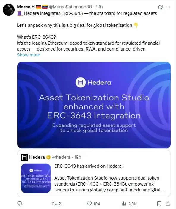 Hedera introduces ERC-3643 into its Asset Tokenization Studio to expand RWAs while staying interoper