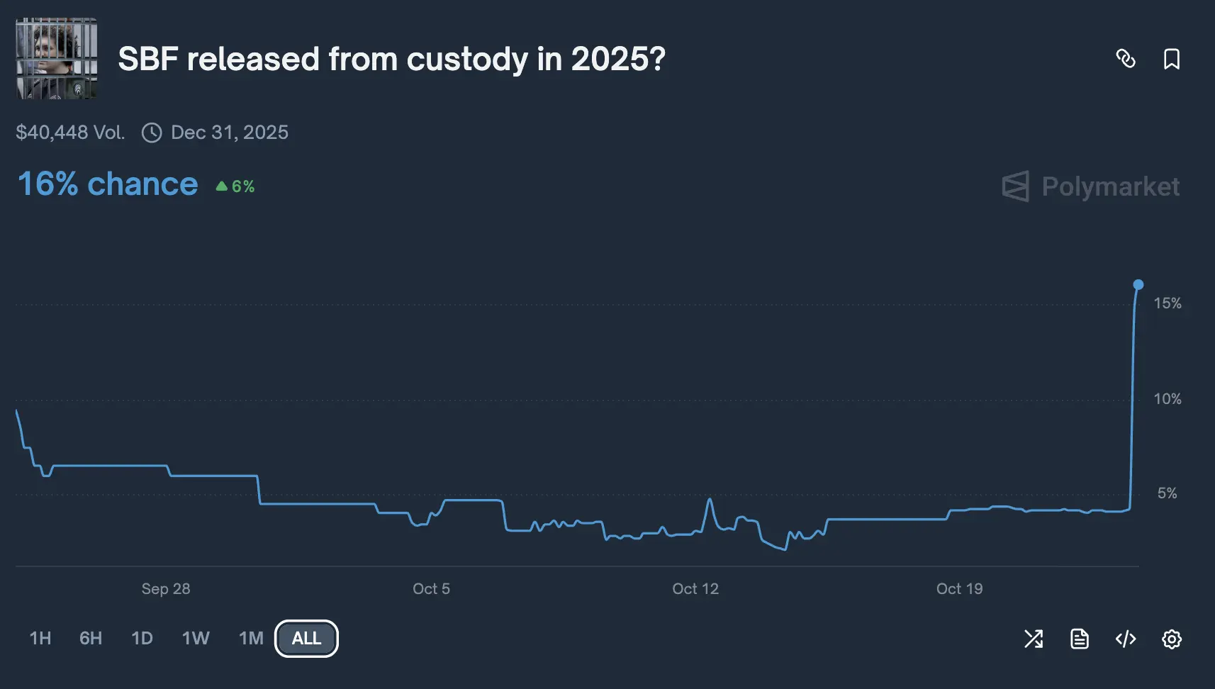 Polymarket bettors have now tipped a 12% chance that former FTX CEO Sam Bankman-Fried will be pardon