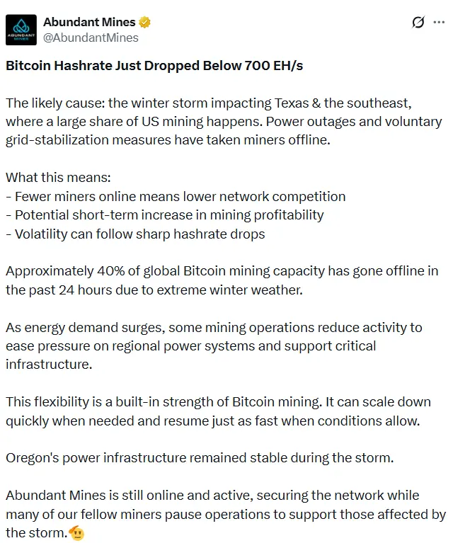 Bitcoin hashrate briefly drops to mid-2025 levels amid US winter storm,