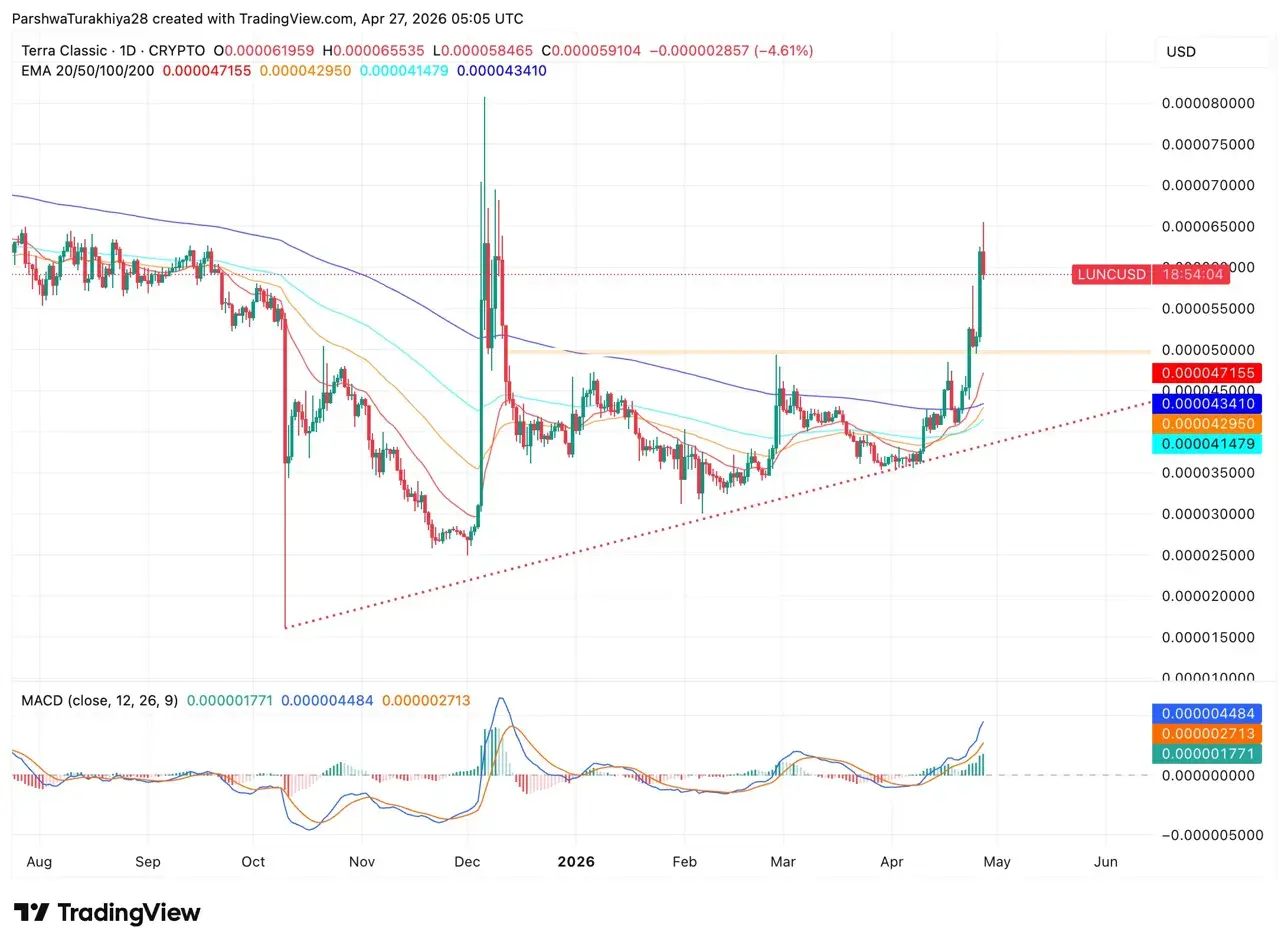 Terra Classic trades at $0.00000591 on April 27, pulling back 4.61% after tagging a yearly high of $