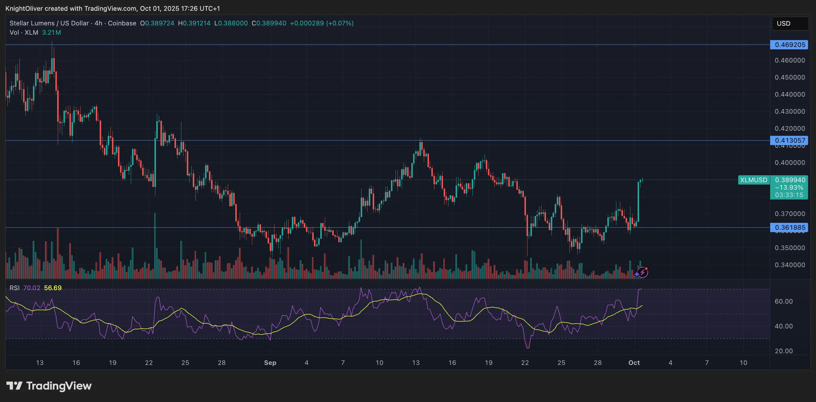 XLM posted a volatile trading session over the past 24 hours, surging from $0.36 to $0.39 before giv