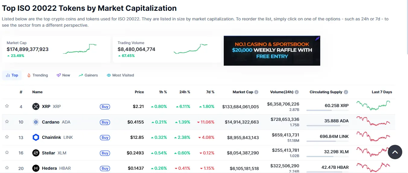Leading crypto aggregator CoinMarketCap has added XRP and Cardano to its newly created ISO 20022 tok