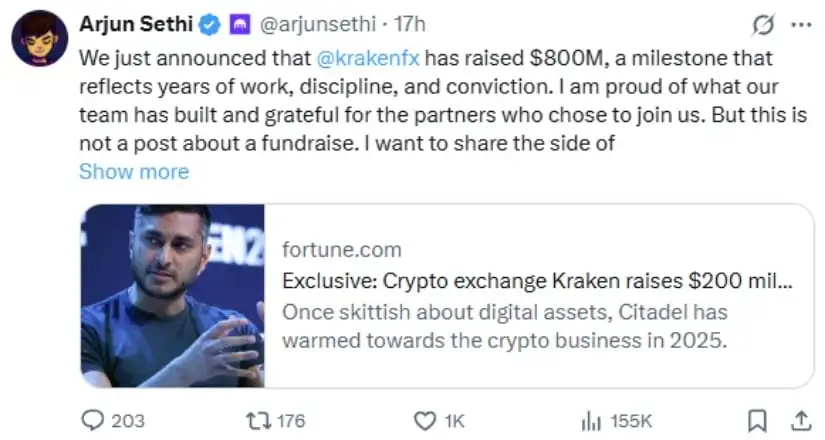 Kraken raised $800 million across two rounds, with one led by Citadel Securities that valued the crypto exchange at $20 billion.