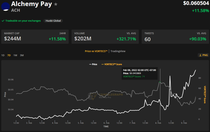Alchemy Pay tiene como objetivo promover la adopción de criptomonedas a través de su sistema de pagos híbrido y, en la última semana, su token ACH ganó un 77 % para negociarse a USD 0.0625 el 9 de febrero.