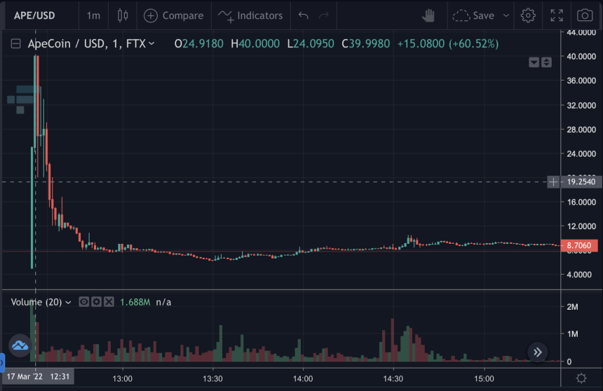 Si bien el precio de los tokens recién cotizados suele ser volátil durante los períodos iniciales de descubrimiento de precios y es difícil saber si las transacciones realmente ocurrieron a estos niveles, los volúmenes en estas velas diminutas pueden dar una buena indicación de cuál era el precio real de APE. después del airdrop.