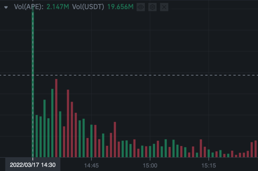 Volumen del primer minuto de APE/USDT. Fuente: Binance