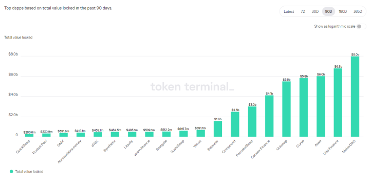 Los principales protocolos son Uniswap, Curve, Aave, Lido y MakerDao. Por ejemplo, la TVL de Lido es de USD 6,800 millones, mientras que MakerDao tiene USD 8,000 millones.