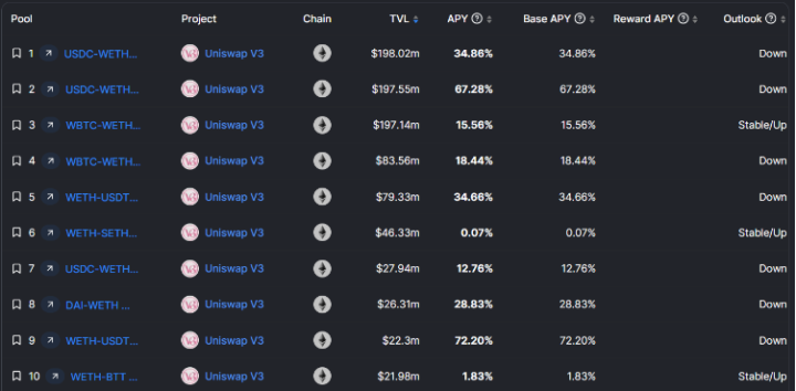 El Ether emparejado con monedas estables en Uniswap es la mejor opción para los proveedores de liquidez. El par está generando como máximo un 72.20% de APY cuando se mira el Ether emparejado con Tether (USDT).