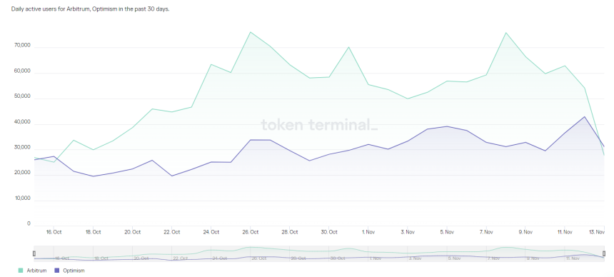 A pesar de que la mayoría de las transferencias provienen de Optimism, las blockchains tienen un número similar de usuarios activos diarios. El 13 de noviembre, Optimism tenía más usuarios activos diarios con 31,117, mientras que Arbitrum tenía 27,714.