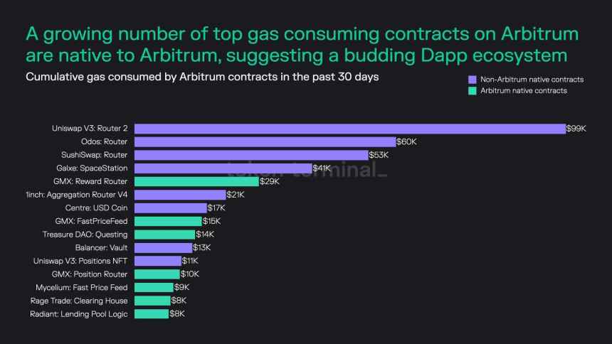 Contratos de consumo de gas de Arbitrum desglosados por DApp. Fuente: Token Terminal