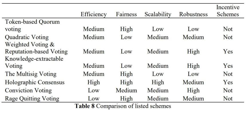 Las técnicas revisadas incluyen: votación por quórum basada en tokens, votación cuadrática, votación ponderada y basada en la reputación, votación extraíble del conocimiento, votación multisig, consenso holográfico, votación por convicción y votación por abandono furioso.