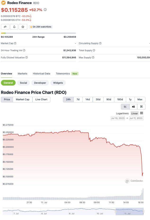 La dirección de la billetera del explotador todavía tiene más de 374 ETH, y Etherscan ha marcado la dirección como vinculada al exploit Rodeo. El protocolo DeFi tenía USD 20 millones en valor total bloqueado (TVL), cayendo por debajo de los USD 500 tras el exploit.