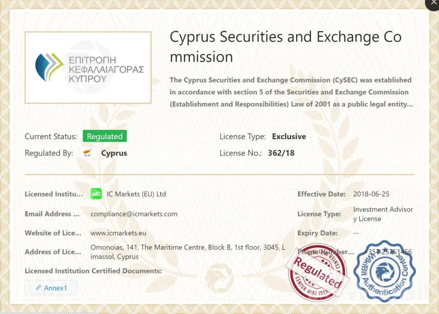 IC Markets está regulado por la Comisión de Valores y Bolsa de Chipre (CYSEC). El intercambio posee una Licencia de Asesoramiento de Inversiones, con el número de licencia 362/18.