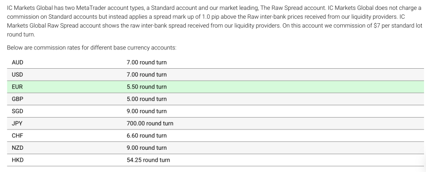 La cuenta Raw Spread, por otro lado, muestra el spread interbancario sin alteraciones de los proveedores de liquidez y conlleva una comisión de $7 por lote estándar por vuelta. Las tasas de comisión varían para diferentes cuentas de moneda base, oscilando entre 5.00 y 9.00 por vuelta.