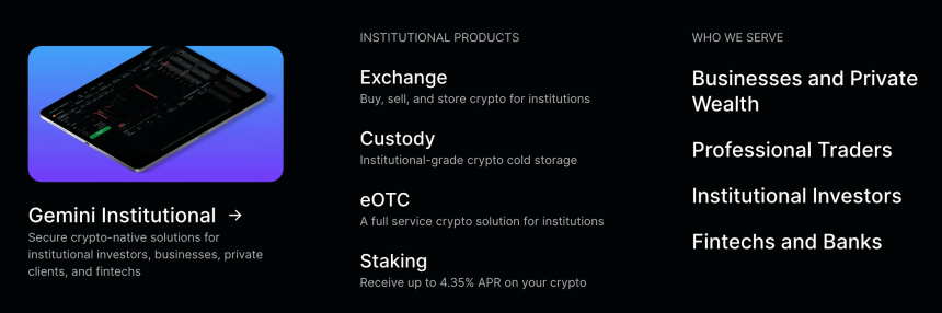 Gemini atiende a clientes institucionales con una variedad de servicios personalizados, que incluyen custodia, trading OTC y soluciones personalizadas para empresas, patrimonio privado, traders profesionales y fintechs.