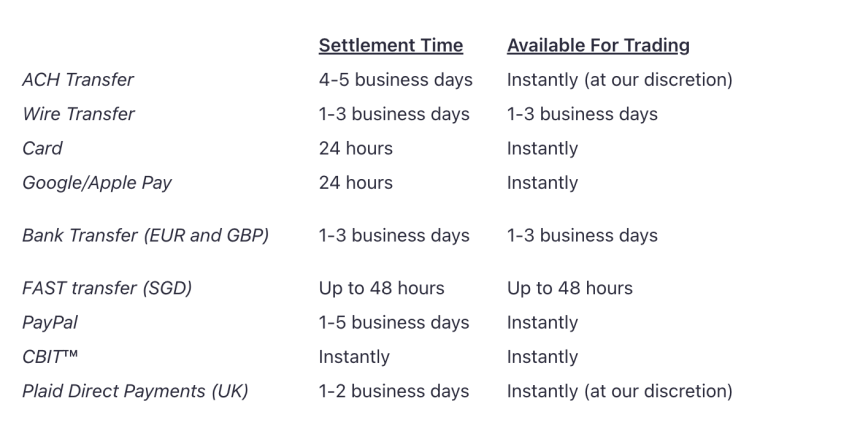 Transferencia bancaria (EUR y GBP): Las transferencias bancarias en EUR y GBP están disponibles para residentes de la Unión Europea y el Reino Unido. Por lo general, tardan de 1 a 3 días hábiles en liquidarse y están disponibles para operar de inmediato.