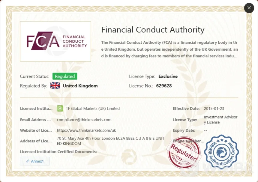 ThinkMarkets opera bajo la regulación de dos agencias reguladoras de renombre. En el Reino Unido, la empresa está regulada por la Autoridad de Conducta Financiera (FCA) con un número de regulación de 629628. La FCA ha otorgado a ThinkMarkets el estatus de regulado, y la empresa tiene una licencia de asesoramiento de inversiones bajo el nombre de TF Global Markets (UK) Limited.