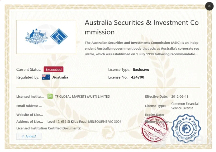 ThinkMarkets también está regulado por la Comisión de Valores e Inversiones de Australia (ASIC) con un número de regulación de 424700. La empresa tiene una Licencia de Servicios Financieros Comunes bajo el nombre de TF GLOBAL MARKETS (AUST) LIMITED. Sin embargo, cabe destacar que su estado actual es"excedido".