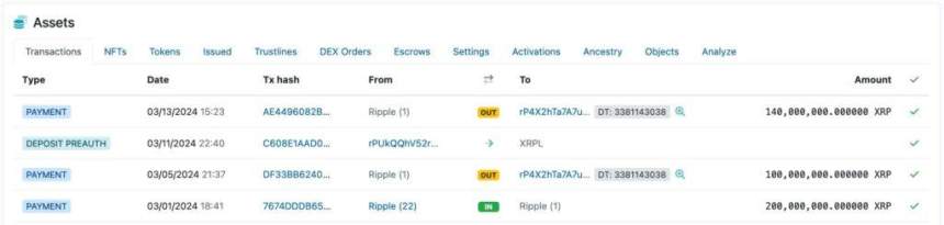 La primera liquidación se produjo el 5 de marzo, cuatro días después de que la cuenta del tesoro de Ripple (Ripple 1) recibiera los 200 millones desbloqueados. Más tarde, la compañía vendió los 140 millones de XRP restantes, de los cuales 40 millones se originaron en una dirección inactiva bajo el control de Ripple, etiquetada como 'Ripple 52' por .