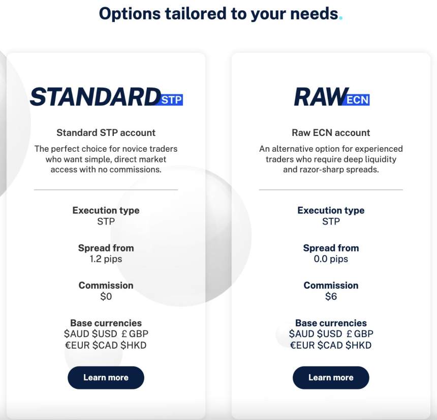 El corredor ofrece dos tipos de cuentas distintas para diferentes niveles de experiencia y necesidades comerciales. La cuenta Standard STP es ideal para traders principiantes. Cuenta con un tipo de ejecución STP (Procesamiento Directo). Con spreads que comienzan desde 1.2 pips y sin comisiones, esta cuenta admite múltiples monedas base, incluyendo AUD, USD, GBP, EUR, CAD y HKD. Por otro lado, la cuenta Raw ECN está dirigida a traders experimentados que requieren alta liquidez y spreads ultra bajos. Operando bajo el mismo modelo de ejecución STP, esta cuenta ofrece spreads desde 0.0 pips pero cobra una comisión competitiva de $6 por operación.