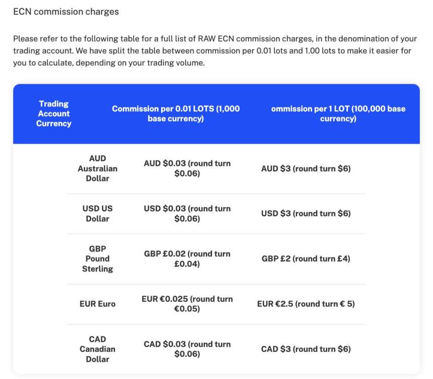 VT Markets cobra tarifas y comisiones estructuradas para adaptarse a diferentes volúmenes de negociación y monedas de cuenta. Para las cuentas de negociación denominadas en AUD, USD, GBP, EUR y CAD, la comisión por 0.01 lotes (1,000 moneda base) se establece uniformemente en AUD $0.03, USD $0.03, GBP £0.02, EUR €0.025 y CAD $0.03 respectivamente (ida y vuelta AUD $0.06, USD $0.06, GBP £0.04, EUR €0.05, CAD $0.06). Para operaciones más grandes de 1 lote (100,000 moneda base), la comisión de ida y vuelta aumenta ligeramente a AUD $3, USD $3, GBP £2, EUR €2.5 y CAD $3.