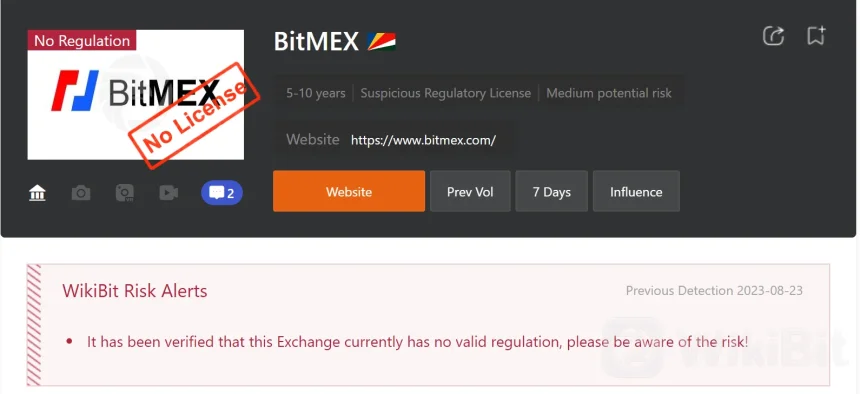 Ang BitMEX ay nag-ooperate bilang isang hindi regulasyon na palitan, na nagpapahiwatig ng kakulangan ng pagbabantay ng mga regulasyon ng mga awtoridad sa kanilang mga operasyon at aktibidad sa pagtitingi.