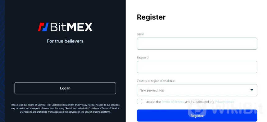 1. Bisitahin ang BitMEX na website at i-click ang"Magrehistro" na button upang simulan ang proseso ng pagpaparehistro.