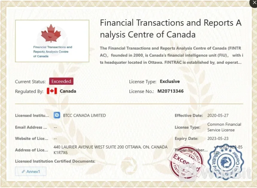 Ang BTCC ay gumagana sa ilalim ng regulatory framework ng Financial Transactions and Reports Analysis Centre ng Canada (FINTRAC). Ang palitan ay tinatawag na"Lumampas" sa kanyang regulatory status. Ang BTCC ay mayroong Common Financial Service License mula sa FINTRAC, na may pangalan ng lisensya na BTCC CANADA LIMITED. Ang Regulation Number na nauugnay sa BTCC ay M20713346. Ang regulatory oversight na ibinibigay ng FINTRAC ay nagtataguyod ng pagsunod sa mga regulasyon sa pananalapi at tumutulong sa pagpapanatili ng integridad ng mga operasyon ng palitan.