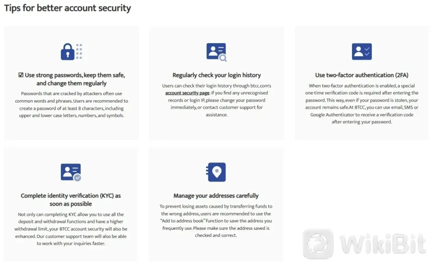 Ang BTCC ay nagpatupad ng iba't ibang mga hakbang sa seguridad upang protektahan ang mga pondo ng mga gumagamit at personal na impormasyon. Ginagamit ng palitan ang mga industry-standard na encryption protocol upang maprotektahan ang pagpapadala at pag-imbak ng data. Bukod dito, sinusunod ng BTCC ang mahigpit na proseso ng pag-verify ng mga gumagamit upang maiwasan ang hindi awtorisadong access sa mga account ng mga gumagamit.