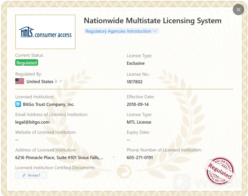 Ang BitGo ay regulado ng Nationwide Multistate Licensing System (NMLS) sa ilalim ng Regulation Number 1817802. Ang palitan ay kategorya bilang"Regulated" at mayroong lisensya ng MTL sa pamamagitan ng kanyang entidad na BitGo Trust Company, Inc.