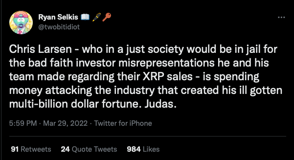 “Chris Larsen — yang dalam masyarakat yang adil akan dipenjara karena itikad buruk investor yang salah mengartikan yang dia dan timnya buat mengenai penjualan XRP mereka — menghabiskan uang untuk menyerang industri yang menciptakan kejahatannya. kekayaan miliaran dolar. Yudas”, tweeted.