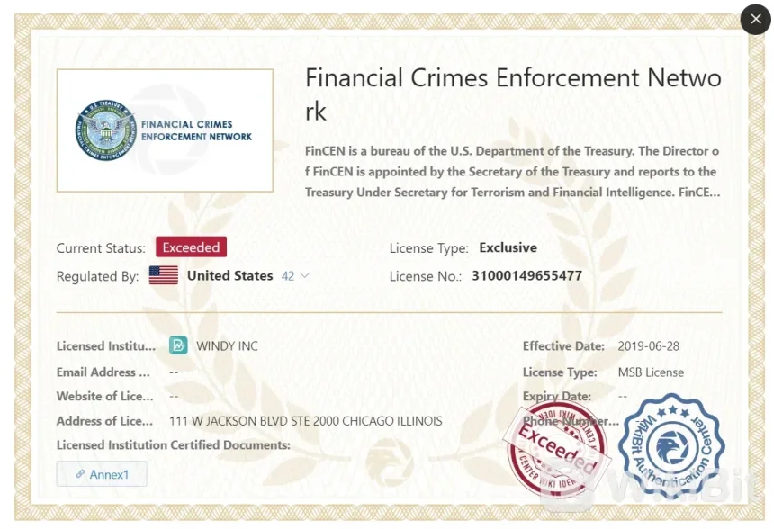 | Status Regulasi | Melebihi. Terdaftar di FinCEN, dimiliki oleh Windy Inc. |
