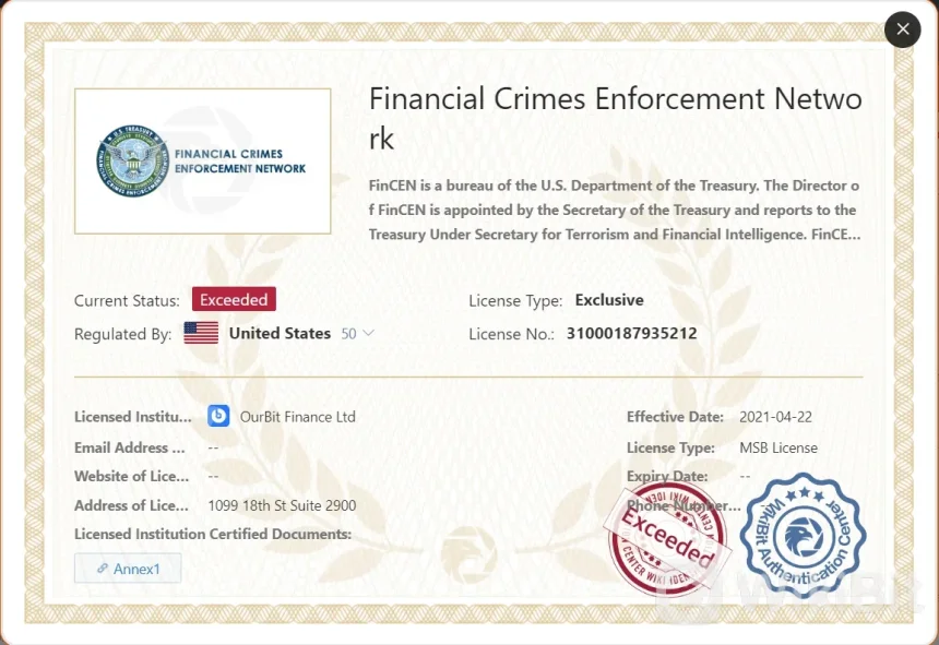 WikiBit 2023-08-17 17:43OurBitadalah platform pertukaran mata uang virtual yang didirikan pada tahun 2017. terdaftar di Amerika Serikat dan beroperasi di bawah otoritas pengatur jaringan penegakan kejahatan keuangan (