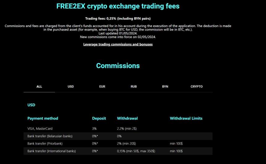 FREE2EX memiliki struktur biaya yang komprehensif untuk perdagangan, deposit, dan penarikan. Biaya perdagangan untuk semua pasangan, termasuk pasangan BYN, ditetapkan pada 0,25% dan dikurangkan dari aset yang dibeli selama transaksi.