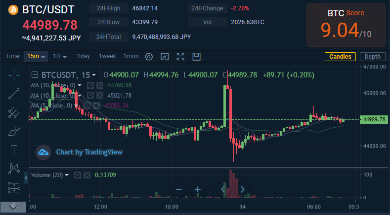 価格:$BTC/ $USDT $44989.78(4,947,227円)