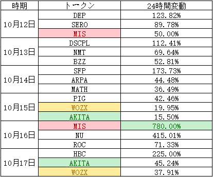10月12日ー10月17日、毎日上昇Top3の情報まとめである。