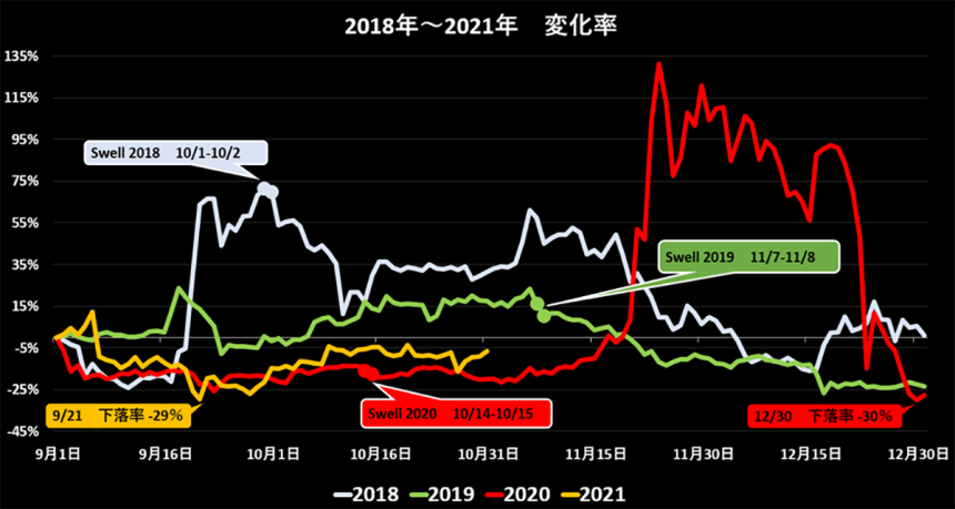上図で、各年Swell以後12月末までの最大下落率は-30%となっており、これは直近安値である9/21での下落率とほぼ同様である。